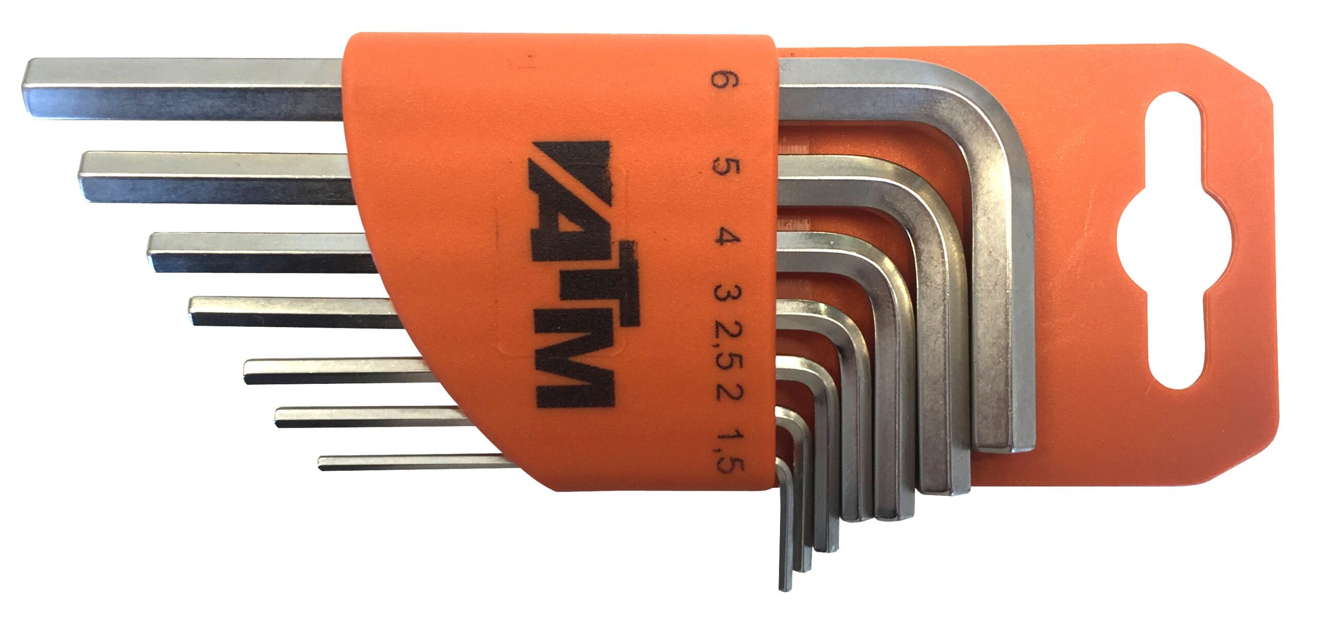 Acero Cromo-Vanadio niquelado ISO 2936 – DIN 911. Soporte plastico naranja con colgador.