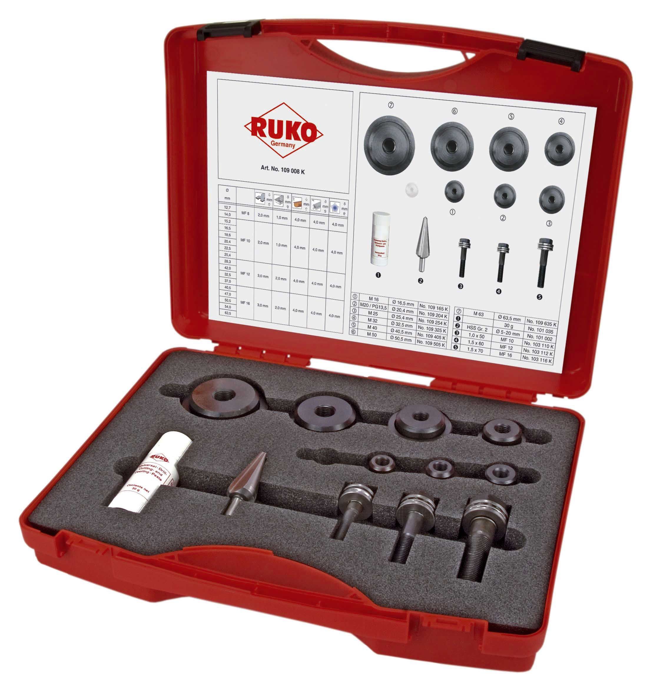 · 7 punzones de tornillo: Ø 16,5 (M 16) + Ø 20,4 (M 20 / PG 13,5) + Ø 25,4 (M 25) + Ø 32,5 (M 32) + Ø 40,5 (M 40) + Ø 50,5 (M 50) + Ø 63,5 mm (M 63)