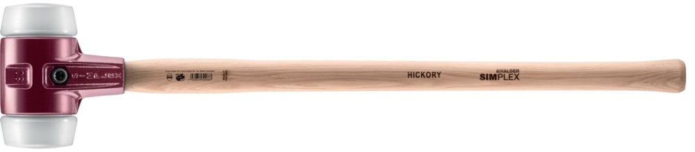 Mallo con bocas y mango intercambiables de forma sencilla y rápida gracias al tornillo central. Cuerpo de dos piezas de acero fundido. Mango de madera Hickory. Bocas de Superplástico blanco: