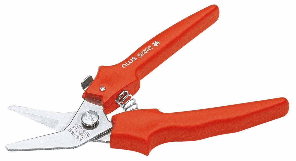 Hojas de acero inoxidable, filo dentado. Muelle de abertura automático con seguro de cierre. Mangos de plástico resistente a impactos. Apta para alambre no templado, plástico, madera, cartón, piel.